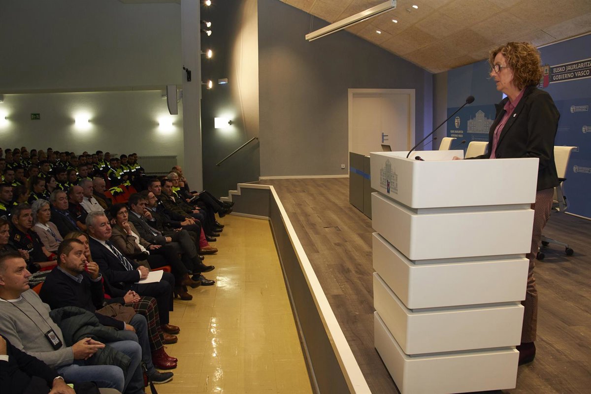 La responsable de Seguridad ha participado este martes en la apertura del curso de formación de un total de 337 aspirantes a Policía Local (66 mujeres y 271 hombres) en la Academia de Arkaute, acompañada de la directora de la Academia Vasca de Policía y Emergencias, Malentxo Arruabarrena, y de cargos del Departamento.
