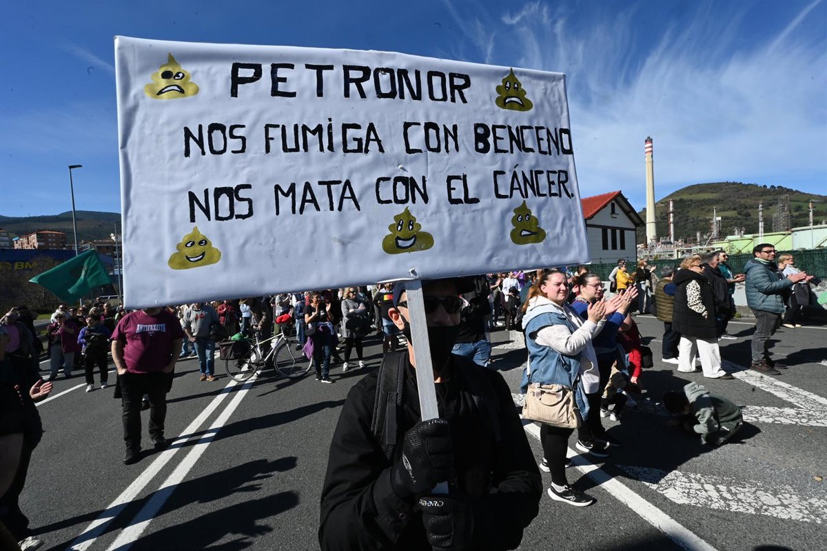 Varias personas portan pancarta con lema 'Petronor nos fumiga con beceno, nos mata con el cáncer' durante una manifestación para denunciar la fuga de benceno en una planta de Petronor, a 1 de marzo de 2026, en Abanto Zierbena y Muskiz (Bizkaia) - David de Haro - Europa Press