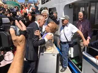 También han participado las autoridades y las personas homenajeadas, después de ser recibidas por escolares en el Puerto Pesquero. Los conocidos como "niños de la guerra" han llegado en una pequeña embarcación, y una vez en tierra, han colocado las flores con las que han sido recibidos, en la grúa que recuerda su evacuación hace ocho décadas.