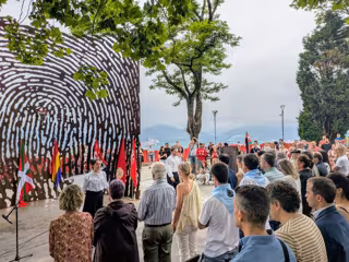 Durante el homenaje, decenas de ciudadanos que se han acercado hasta el lugar, turistas curiosos y representantes de las asociaciones y grupos con ikurriñas, banderas republicanas y CNT, que han rodeado la escultura.