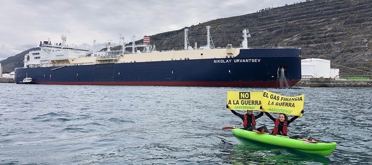 Activistas de Greenpeace han protestado a primera de la tarde de este jueves contra la guerra en Ucrania y han denunciado la relación entre los combustibles fósiles y la financiación y el desencadenamiento de conflictos frente a un metanero de gas ruso atracado en el Puerto de Bilbao.