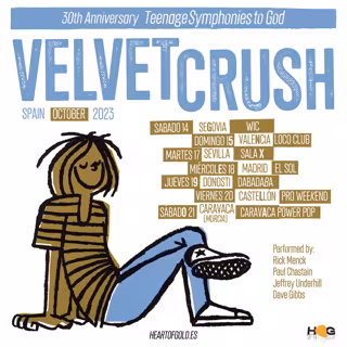 La banda de power pop Velvet Crush visita España dentro de la gira 30 aniversario de su disco 'Teenage Symponies To God'. Los de Rhode Island llevan en activo desde principios de los 90 y su sonido conecta sin lugar a dudas con los seguidores de Teenage Fanclub, Big Star y sobre todo, Matthew Sweet. Les acompaña en esta gira como músico invitado Dave Gibbs de Gigolo Aunts.