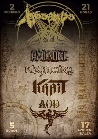 Los grupos donostiarras Hail Noise, Khymaira, Krait y AOD ofrecerán este sábado 2 de febrero en la sala de conciertos Mogambo de San Sebastián una noche de conciertos de rock y metal.
