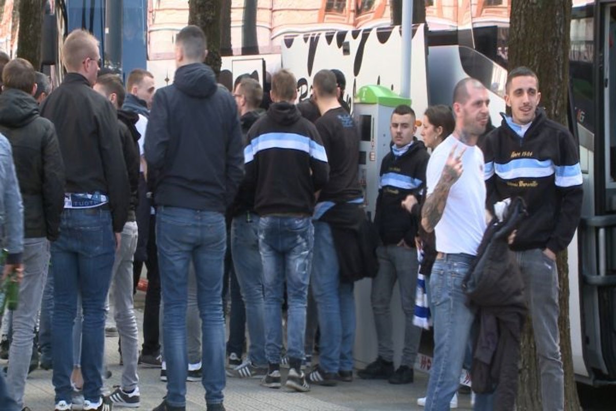 Los ultras del Olympique iban detrás de una pancarta de grandes dimensiones en la que se podía leer Marsella y han sido conducidos por los ertzainas hasta San Mamés, donde a las 19.00 horas se celebrará el partido de la Europa League.