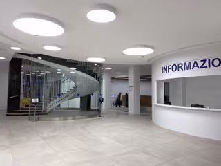 Por su parte, el reformado puesto de información recibe a las personas en un vestíbulo de 250 m2 en la entrada del hospital, integrado en un espacio semicircular que anticipa la restaurada y singular escalera circular del Hospital. Además, se ha restaurado el porche exterior cubierto y se han renovado las puertas de acceso sin alterar el aspecto exterior del edificio.