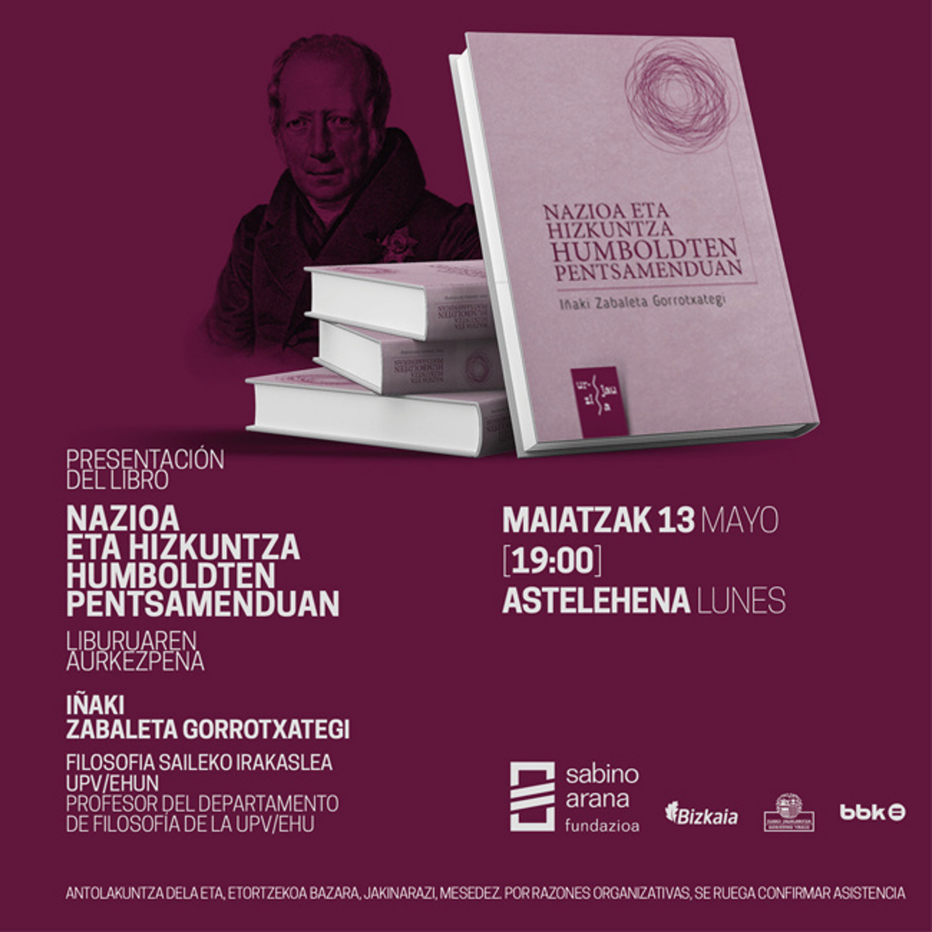 Cartel de la presentación del libro de Iñaki Zabaleta 'Nazioa eta hizkuntza Humboldten pentsamenduan' en la Fundación Sabino Arana. - SABINO ARANA FUNDAZIOA