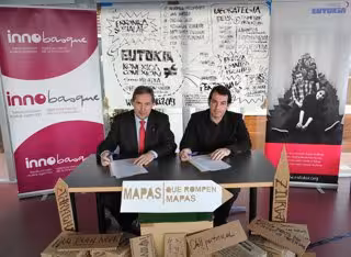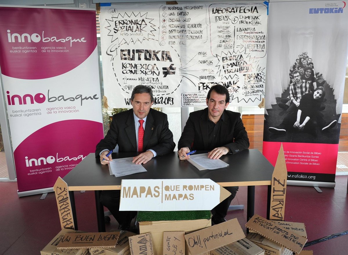 El director general de la Agencia Vasca de la Innovación, Innobasque, José María Villate, y el coordinador del proyecto Eutokia, Centro de Emprendizaje e Innovación Social, José Antonio Sáez de Ocáriz, han firmado este martes un acuerdo de cooperación para la puesta en marcha y desarrollo del plan de acciones que favorezca la creación de empresas sociales innovadoras, y que sitúen a Eutokia como el espacio de referencia para el emprendedor social.