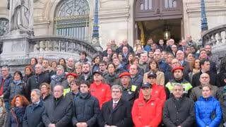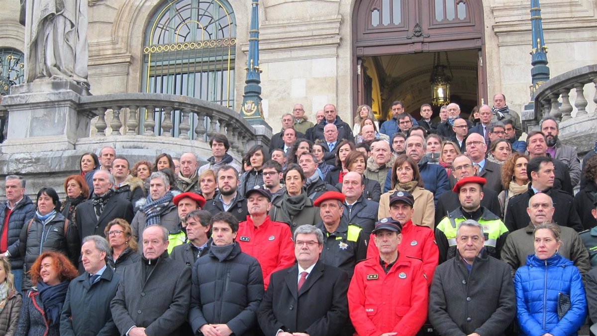 Representantes institucionales, políticos, sindicales y de cuerpos policiales se han concentrado, junto a numerosos ciudadanos, ante el Ayuntamiento de Bilbao para condenar los incidentes registrados este pasado jueves en el entorno del estadio de San Mamés y para mostrar su solidaridad con la familia y los compañeros del agente que falleció mientras formaba parte del dispositivo de seguridad con motivo del partido entre el Athletic y el Spartak de Moscú.