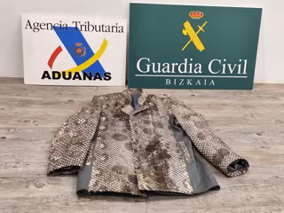 Efectivos de la Guardia Civil de la Sección Fiscal y de Fronteras del aeropuerto de Bilbao, junto a funcionarios del Servicio de Vigilancia Aduanera de la Agencia Tributaria, han intervenido el pasado mes de junio una chaqueta de piel de la especie protegida Anaconda Gigante que vestía un pasajero en la sala de llegadas del aeródromo vizcaíno. El viajero llevaba, además, 10.900 euros sin declarar.