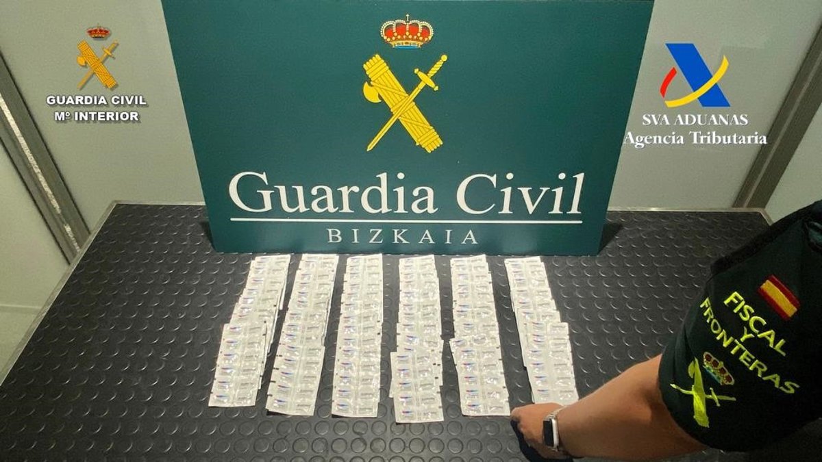 Agentes de la Guardia Civil de la Sección Fiscal y Fronteras del aeropuerto de Bilbao, junto con funcionarios del Servicio de Vigilancia Aduanera de la Agencia Tributaria, han intervenido 600 comprimidos anabolizantes, concretamente de metandrostenolona, a un pasajero procedente de la Republica Dominicana.