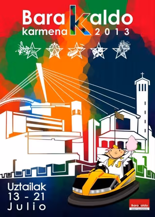 El protagonista del cartel de este año es un 'Jolín' -mascota de las fiestas- "tan festivo como deportivo, ya que aparece al volante de un auto de choque con los colores gualdinegros y la bandera del Barakaldo Club de Fútbol, así como con un algodón de azúcar rosa en la mano", ha explicado el Ayuntamiento.