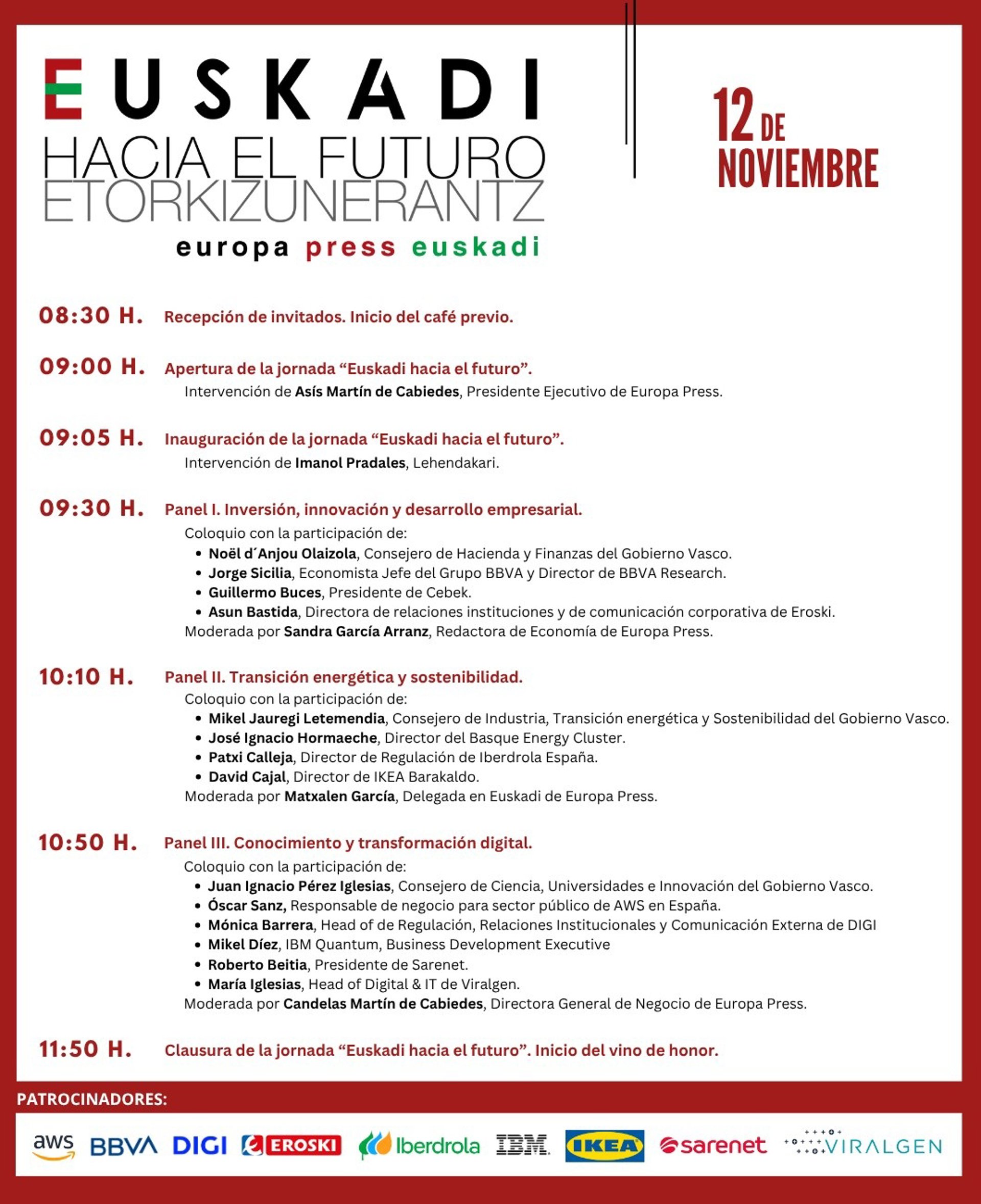 Una jornada económica organizada por Europa Press Euskadi bajo el título "Euskadi hacia el futuro" abordará este miércoles en Bilbao los retos y transformaciones que debe afrontar en Euskadi de cara a impulsar su crecimiento y competitividad de la mano del Lehendakari, Imanol Pradales, y de distintos representantes institucionales y del ámbito empresarial vasco.