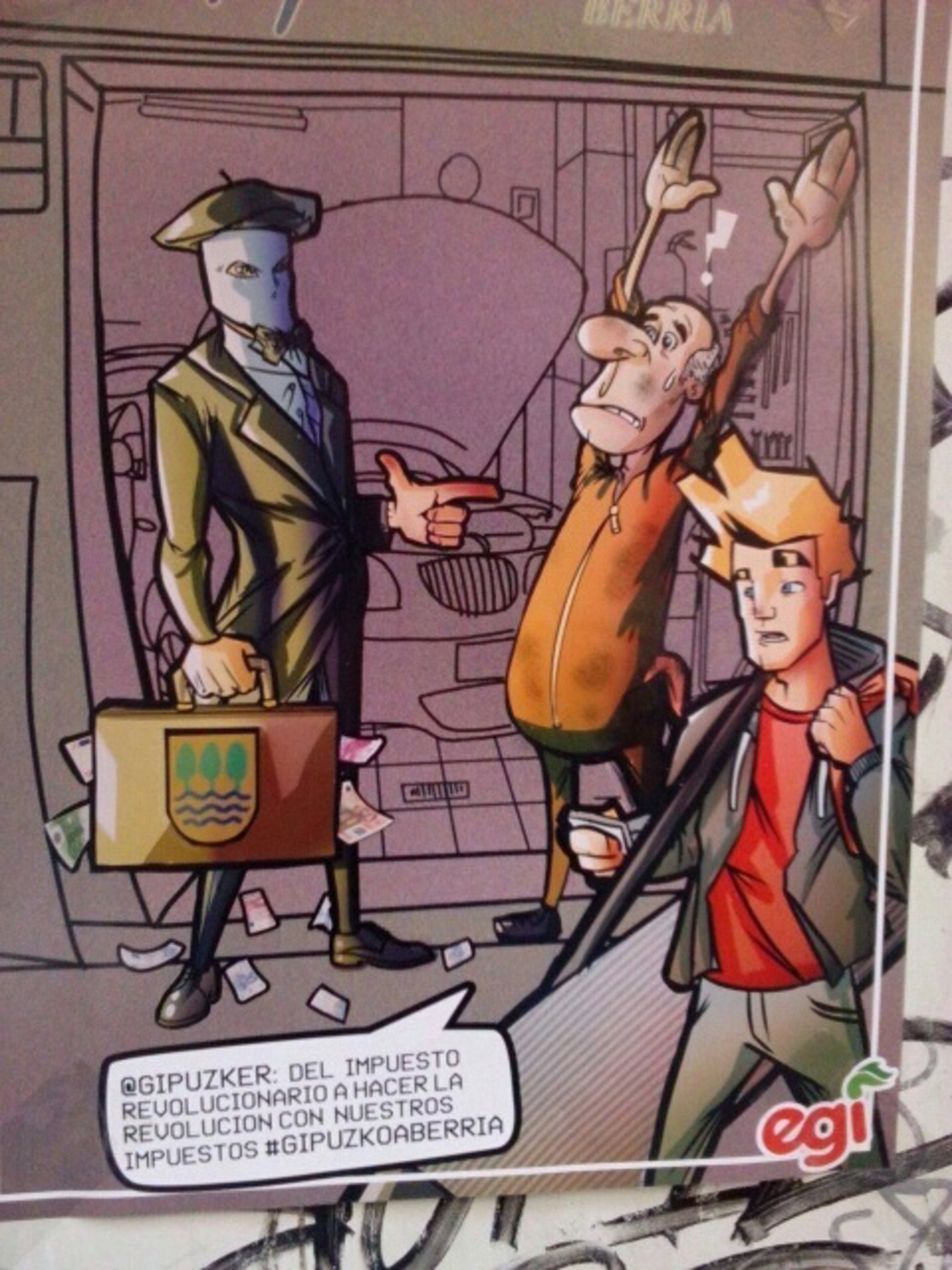 Los citados carteles, firmados por EGI, muestran a un encapuchado que porta un maletín con el escudo de Gipuzkoa repleto de billetes apuntando con la mano en forma de pistola a un ciudadano. En el texto puede leerse "@gipuzker: del impuesto revolucionario a hacer la revolución con nuestros impuestos #gipuzkoaberria".