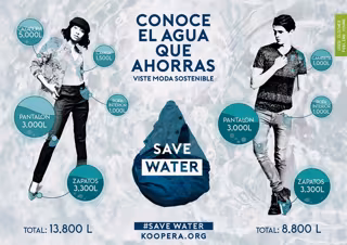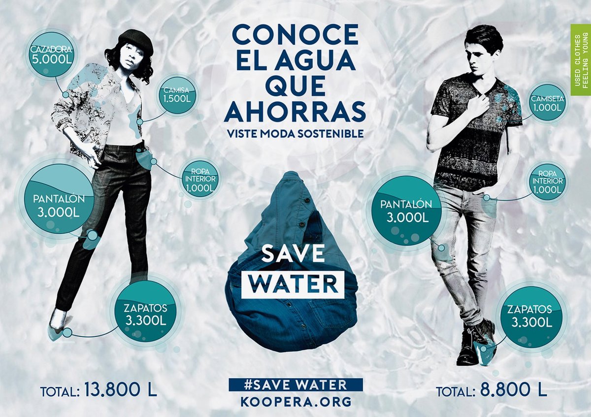 Por ello, Koopera ha lanzado la campaña #SaveWater, con la que hace un llamamiento al ahorro de agua y al consumo sostenible en la moda. Consciente de "la importancia del agua para la vida de miles de millones de personas", la campaña de Koopera incluye el lanzamiento de una aplicación en su web que permite calcular "cuánta agua se consume en la fabricación de las prendas de vestir, y cuánta puede ahorrarse vistiendo moda más sostenible".