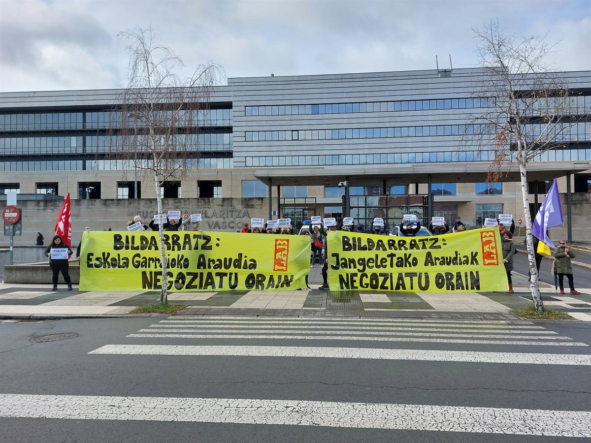 El sindicato LAB se ha movilizado este jueves ante la sede del Gobierno Vasco, en Vitoria-Gasteiz, para exigir al Departamento de Educación del Gobierno Vasco que haga una "apuesta real" por los comedores escolares, y convoque "urgentemente" a los y las representantes de los y las trabajadoras a una mesa de diálogo.