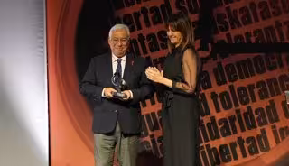 La secretaria general del PSE-EE, Idoia Mendia, y el primer ministro de Portugal, Antonio Costa, en la entrega de los Premios Ramón Rubial en Bilbao. - PSE-EE
