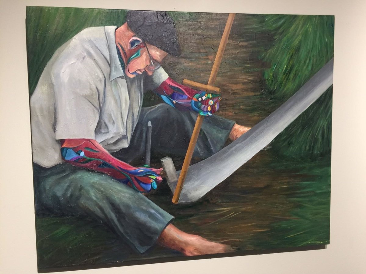 Por su parte, el artista Asier Biota presenta tres pinturas de labores de baserritarras que también enlazan con el deporte rural vasco, y de dos bodegones que reflejan una piedra, y un tronco y un hacha, respectivamente. Amalia y Asier han elaborado un cuadro de mayor dimensión que continúa reflejando las labores de los caseríos.