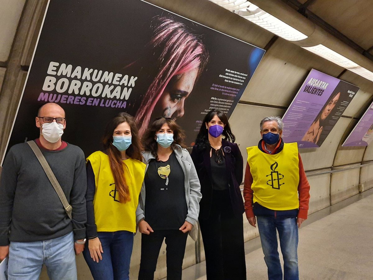 La directora de Capital Humano de Metro Bilbao, Rosa Fernández-Villa, y los representantes de Amnistía Internacional Javier Maura, Leticia Viña y Paloma Arias han inaugurado este jueves la exposición fotográfica "Mujeres en lucha", en víspera de la celebración del Día Internacional de la Mujer el próximo 8 de marzo.