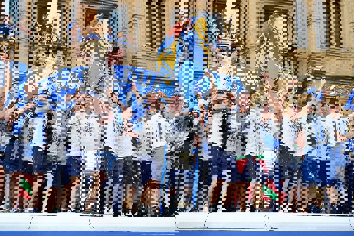 Los jugadores de la Real Sociedad han saludado a los aficionados y han bailado y celebrado su victoria de camino al Ayuntamiento donostiarra. También se han sumado a los saltos y bailes, al ritmo de la música, los miembros del equipo técnico, con el entrenador Pelegrino Matarazzo a la cabeza.