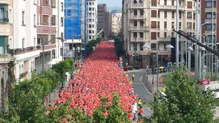 En una movilización convocada por la plataforma en favor del derecho a decidir, Gure Esku Dago, los participantes, ataviados con camisetas rojas, han conformado con globos del mismo color un mosaico en forma de signo de interrogación entre la Plaza Elíptica y la Plaza Euskadi de la capital vizcaína.