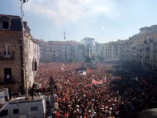 Miles de personas han asistido esta tarde, en la Plaza de la Virgen Blanca de Vitoria, a la tradicional 'Bajada del Celedón', en un acto en el que se ha hecho un llamamiento a combatir la violencia sexista y en el que, por primera vez en la historia, se ha prohibido la introducción de envases de vidrio para evitar cortes entre los asistentes al inicio oficial de las fiestas de la capital alavesa.
