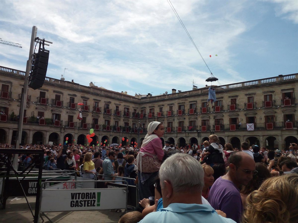 Miles de vitorianos han asistido este lunes, en la Plaza Nueva de Vitoria, a la 'Bajada de Celedón y Neska Txiki', el acto central de la programación infantil de las fiestas de la Virgen Blanca de la capital alavesa.
