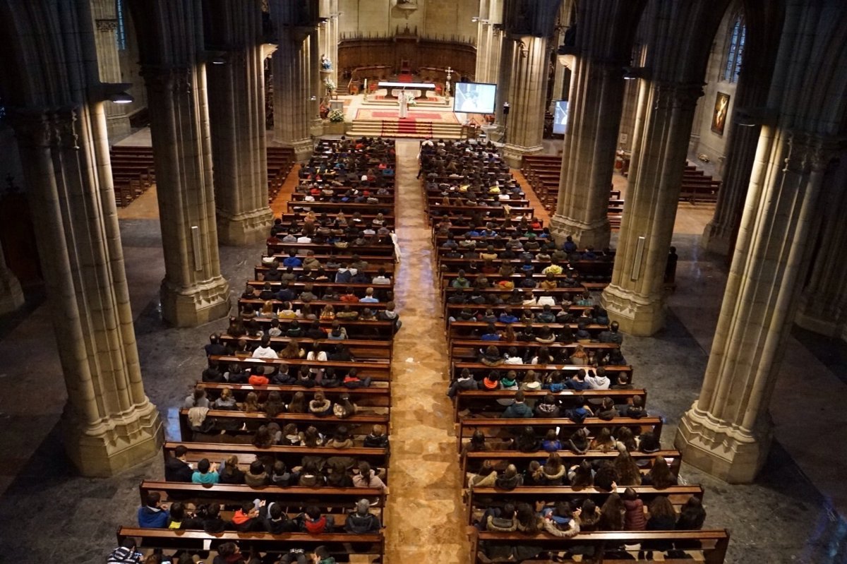El obispo de San Sebastián, José Ignacio Munilla, se ha reunido con más de 600 alumnos de ESO y Bachiller de centros educativos de Gipuzkoa en la catedral del Buen Pastor de San Sebastián, para celebrar la jornada mundial de la paz, que este año se centra en la esclavitud del siglo XXI.