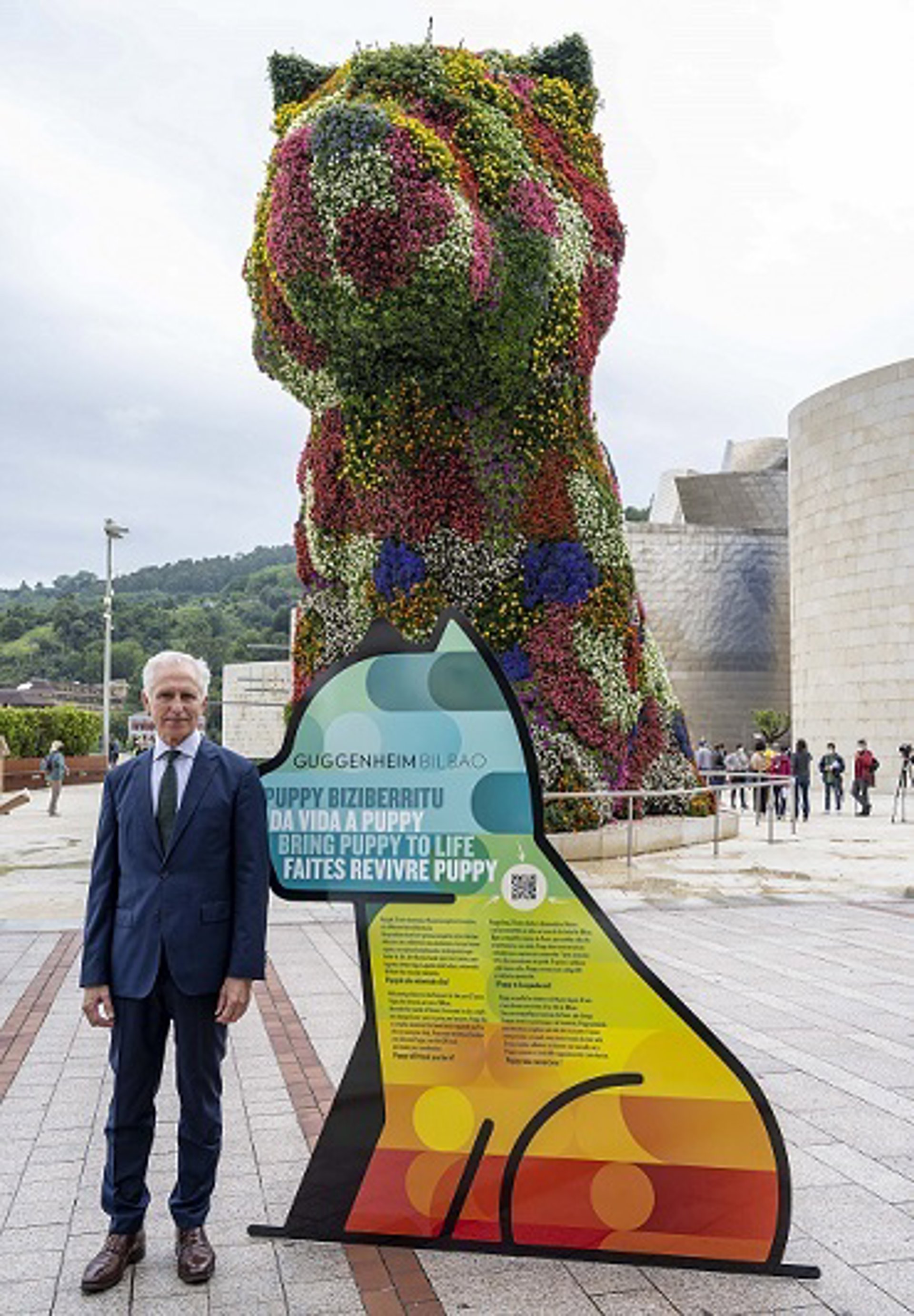 Desde el Museo han recordado que Puppy lleva "dando la bienvenida" al Guggenheim Bilbao desde su inauguración en octubre de 1997, cuando entró a formar parte de la Colección. Esta escultura de más de doce metros de altura, que representa a un West Highland terrier gigante, está diseñada con la finalidad de "atraer, suscitar optimismo" e infundir, en palabras del artista Jeff Koons, "confianza y seguridad".