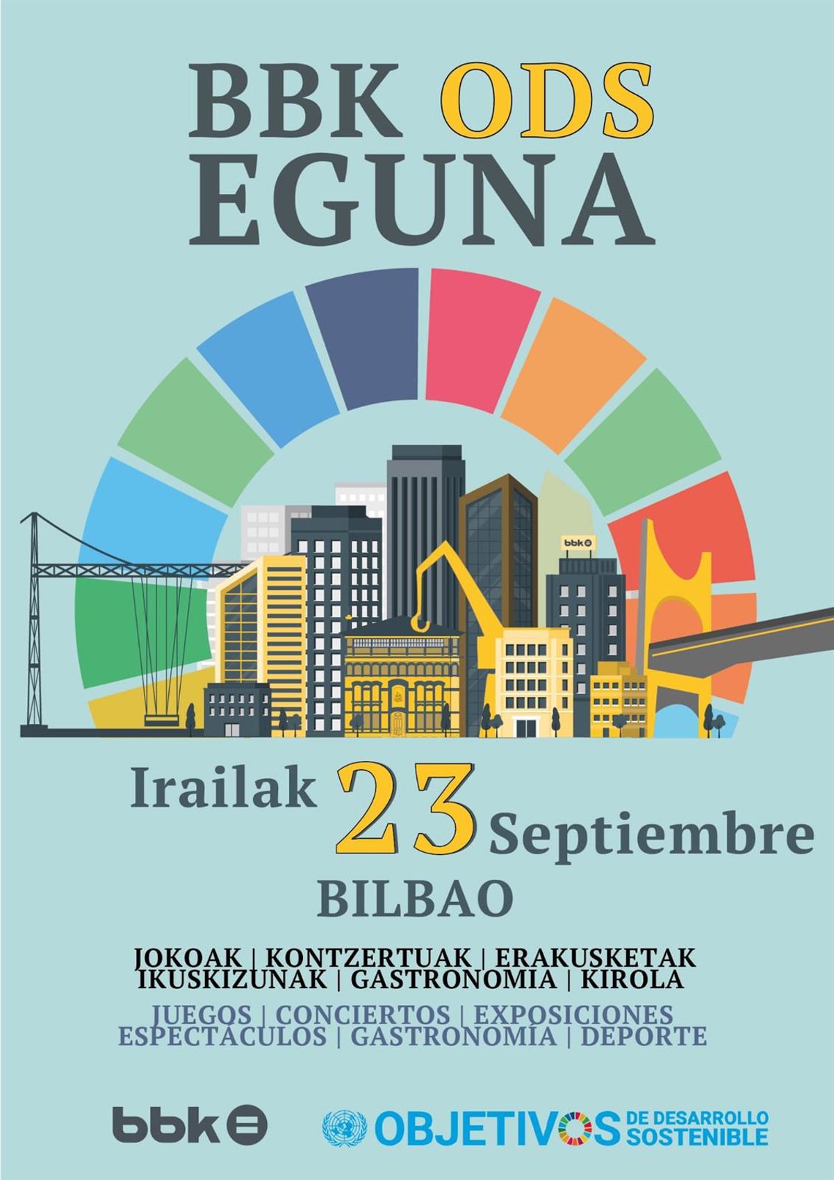 Una nueva edición del BBK ODS Eguna llenará este sábado Bilbao de espectáculos, juegos, talleres, deporte, exposiciones o propuestas de gastronomía y moda con un objetivo común de sacar los Objetivos de Desarrollo Sotenible (ODS) a las calles y acercarlos a todos los públicos.