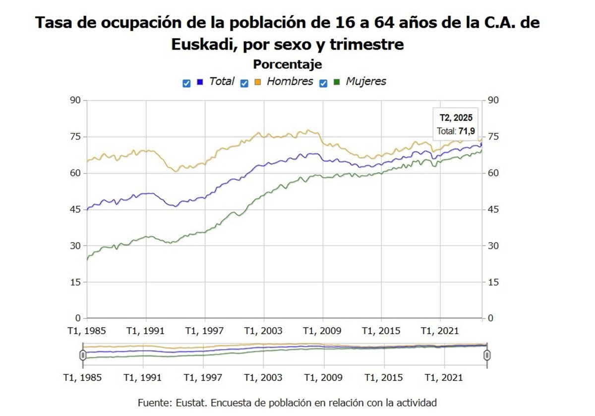 Tasa de ocupación de la población de 16 a 64 años de la C.A. De Euskadi, por sexo y trimestre, que se sitúa en el 71,9% en el segundo cuatrimestre de 2025. - EUSTAT