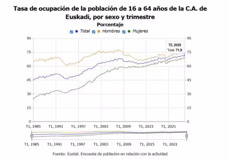 Los datos del segundo trimestre de 2025 en Euskadi reflejan que el paro se sitúa en el 5,7%, un punto y tres décimas menos que al término del primer trimestre del año, lo que se traduce en 13.200 parados menos, y un aumento de 18.900 personas ocupadas más que suman en total 1.010.400, según Eustat, pero, entre los jóvenes de 16 a 24 años, la tasa de ocupación disminuye del 29,4% al 27,7%.