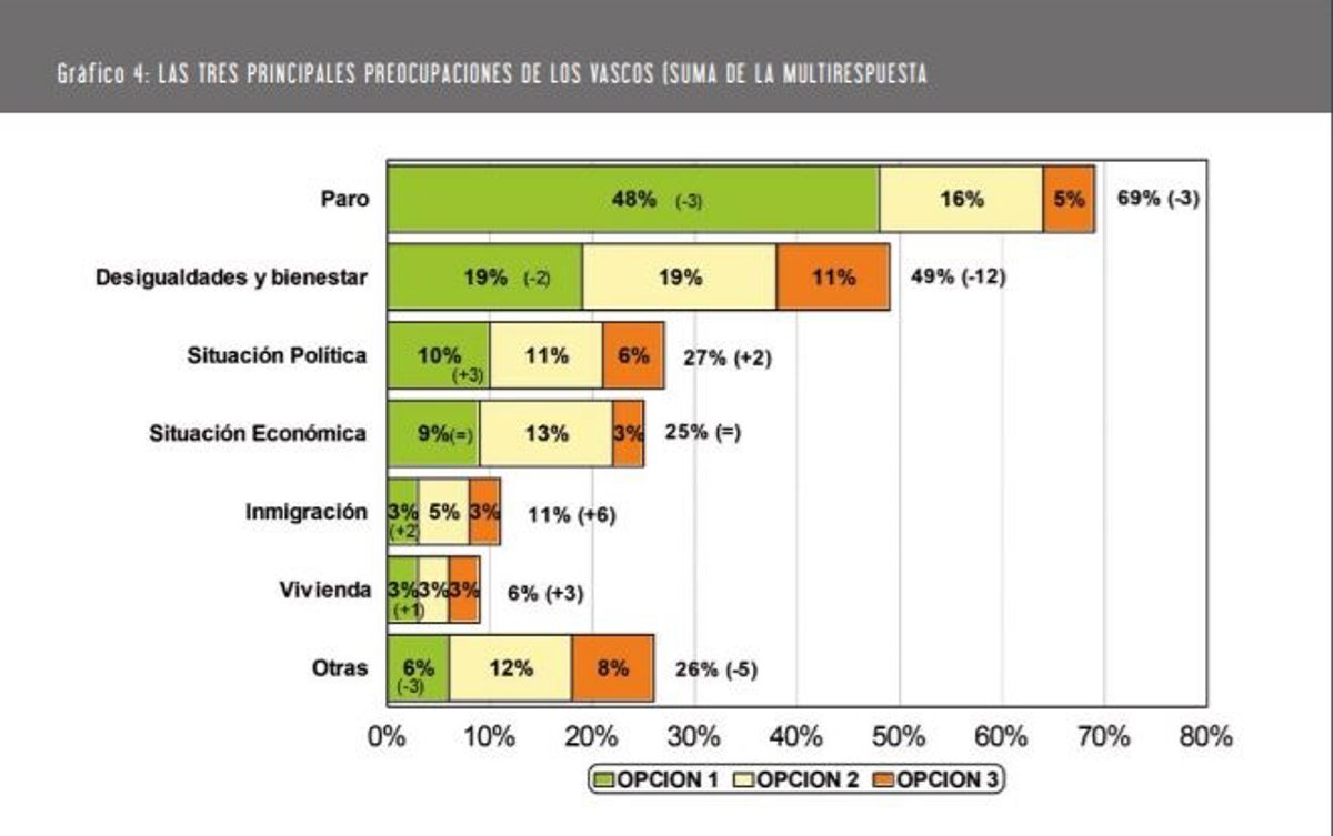 Ocho de cada diez encuestados dicen sentir o haber sentido los efectos de la crisis (el 40% mucho o bastante y un 43% algo), y el desempleo se mantiene como la primera preocupación para los vascos, ya que es citado como el primer problema por el 48% de los encuestados, con un retroceso de tres puntos en los últimos seis. De esta forma, ha destacado Llera, el paro "ya suma 22 puntos de retroceso como principal problema en los últimos tres años, que son tiempos de optimismo, recuperación y mejora".