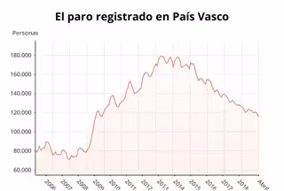 Con respecto al mes de abril de 2018, el desempleo cayó en la Comunidad Autónoma Vasca en 9.260 personas, lo que representa un descenso interanual del 7,41%.
