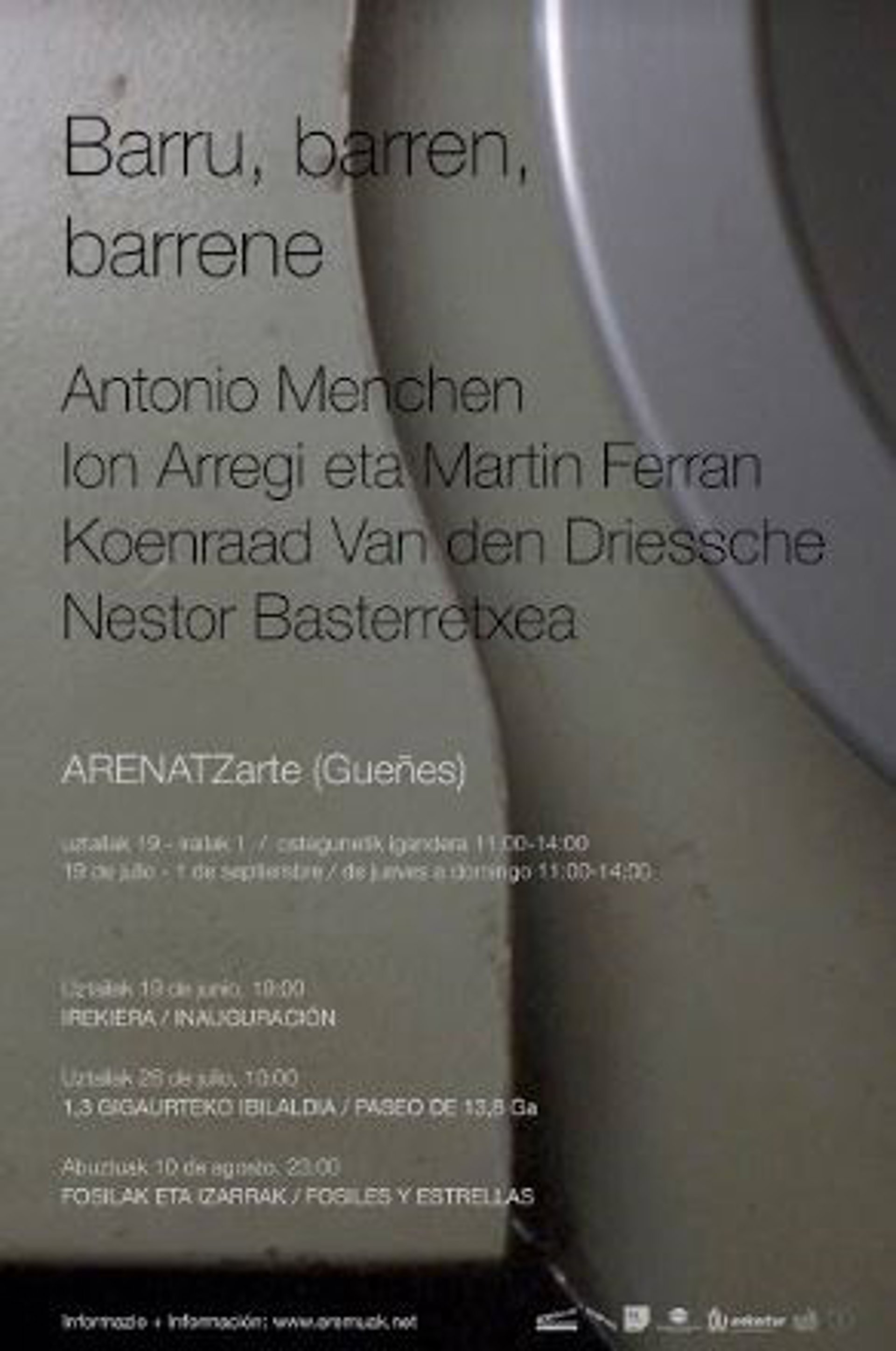 El parque ARENATZarte de Güeñes acogerá hasta el 1 de septiembre la exposición itinerante 'Barru, barren, barrene', que llega desde la presa de Arriaran, en Beasain. El conjunto, con obras de los artistas Néstor Basterretxea, Antonio Menchen, Koenraad Van den Driessche, Ion Arregi y Martín Ferrán, se despliega en Güeñes como el segundo capítulo de una muestra experimental, ya que los trabajos que se presentan en ella siguen 'en curso' y sufren variaciones en cada paso.