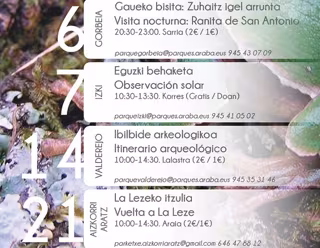 arqueológicos más destacados de Valderejo, mediante un itinerario de 13 kilómetros guiado por expertos de 'Ondare Babesa' (día 14). Además, se visitarán los rincones más singulares de Aizkorri-Aratz, con un paseo guiado por La Leze, que partirá del parketxe en Araia y pasará por el monte Olano, el collado de Artzanegi y los encinares que descienden hasta la cueva (día 21 de abril).