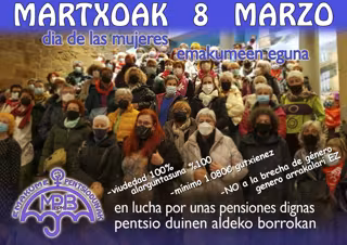 Las mujeres del Movimiento de Pensionistas de Bizkaia han denunciado que "miles de mujeres siguen malviviendo con pensiones de miseria" y no hay "ninguna medida" que persiga "acabar con la brecha de género". Por ello, entre otras reivindicaciones, han exigido que la pensión de viudedad "se corresponda con el 100% de lo cobrado por el cónyuge sin limitaciones de edad".