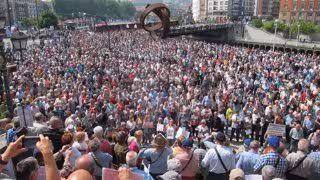 Miles de pensionistas y jubilados se han vuelto a concentrar este lunes frente al Ayuntamiento de Bilbao para reclamar pensiones dignas, en una movilización en la que se ha vuelto a pedir la dimisión del presidente del Gobierno, Mariano Rajoy, y al PNV que "se moje y asuma su responsabilidad sin echarse atrás".