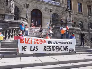 Asimismo, y entre gritos de "ni un paso atrás, pensionistas aurrera", los presentes han mostrado carteles en los que se acusaba a las residencias privadas de ser "campos de exterminio".