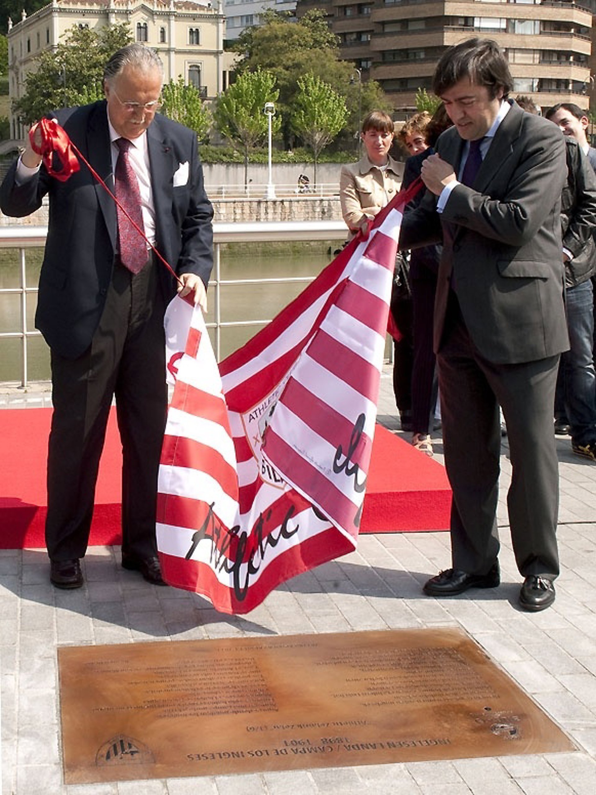 El presidente del Athletic Club, Fernando García Macua, y el alcalde de Bilbao, Iñaki Azkuna, han procedido este viernes, 29 de abril, a descubrir una placa conmemorativa en la antigua Campa de los Ingleses, uno de los espacios donde a finales del siglo XIX comenzó a germinar la afición por el fútbol en Bilbao y que terminó dando origen al Athletic.