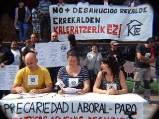 Representantes de la plataforma, encabezados por el portavoz Iñigo Parga, han comparecido para denunciar las maniobras de "despiste social" de la Instituciones, Bancos y Cajas, mediante las cuales "pretenden aparentar preocupación por lo desahucios", mientras "no bajan las cuotas a los que deben, imponen condiciones tan restrictivas que resultan inviables, y no ponen a disposición de los ciudadanos desahuciados suficientes viviendas sociales, a pesar de las recomendaciones europeas que exigen modificaciones legales".