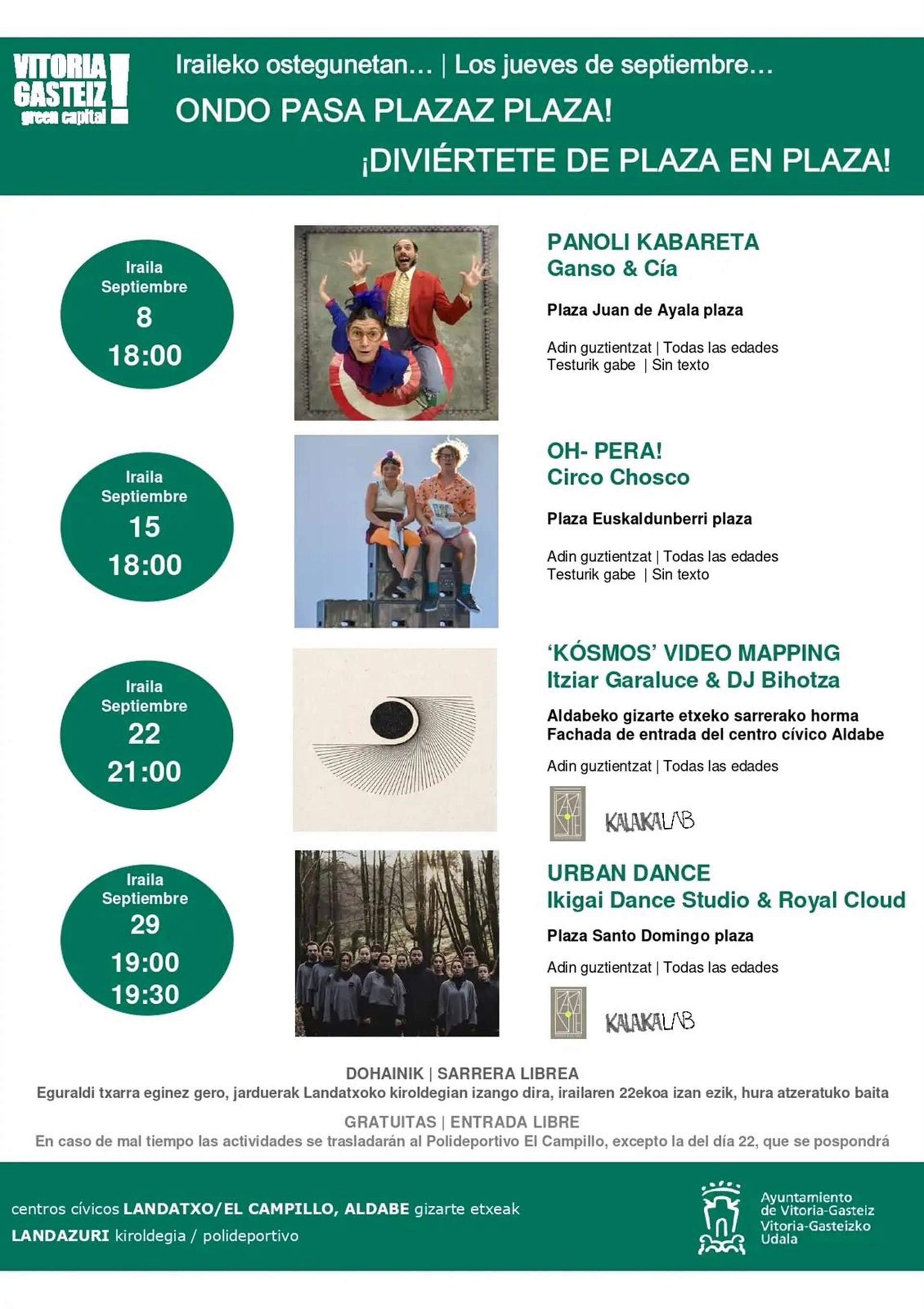 El 15 de septiembre a las 18.00 horas en la Plaza Euskaldunberri, se ha programado la actuación 'Oh-Pera!' de Chirco Chosco, también para todas las edades.