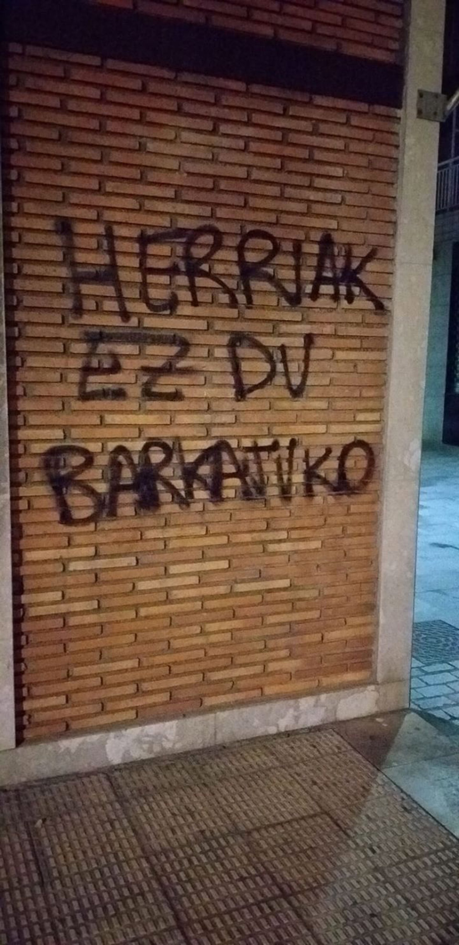 A través de sus redes sociales, la Ejecutiva del PNV en Bizkaia ha denunciado este "nuevo ataque" registrado durante la pasada noche, en esta ocasión, en el establecimiento que PNV tiene en Repélega, en cuyas fachadas desconocidos pintaron proclamas como 'herriak ez du barkatuko' (el pueblo no perdonará) y 'Patxi Ruiz gose eta egarri greban' (Patxi Ruiz en huelga de hambre y sed).