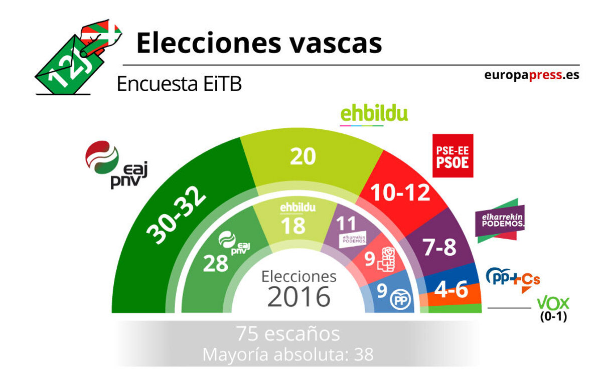 El PSE mantendría sus tres asientos, con un 13% del voto. Elkarrekin Podemos perdería uno y, con un 9,3% del sufragio, obtendría dos. La coalición PP+Cs también lograría un parlamentario menos y conservaría solo uno de los dos logrados cuando se presentó en solitario, con el 5,6% de las papeletas.