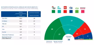 Por detrás se situarían EH Bildu, con el 32,2% de los votos válidos y los actuales 27 escaños; el PSE-EE, con el 14,3% de los votos y 12 escaños; el PP, con un respaldo electoral del 8,7% y 7 escaños; y Vox, con el 2,9% de los votos y un único representante.