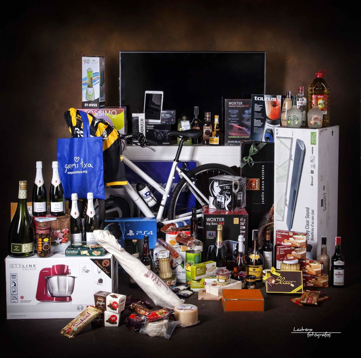 La cesta incluye productos de alimentación (ibéricos, vinos y licores, chocolates, turrones, bacalao, conservas), dispositivos electrónicos (TV de 50', consolas de videojuegos, cámaras de fotos y de vídeo, tablets y ordenadores portátiles, robots de cocina o de aspiración, Home Cinema,), viajes y productos de ocio (circuitos termales, tratamientos de belleza o peluquería, noches de hotel, menús en sidrerías y restaurantes en diversas localidades vascas, limpieza de vehículos o décimos de lotería), además de ropa, entre la que destaca una chamarra calefactable.