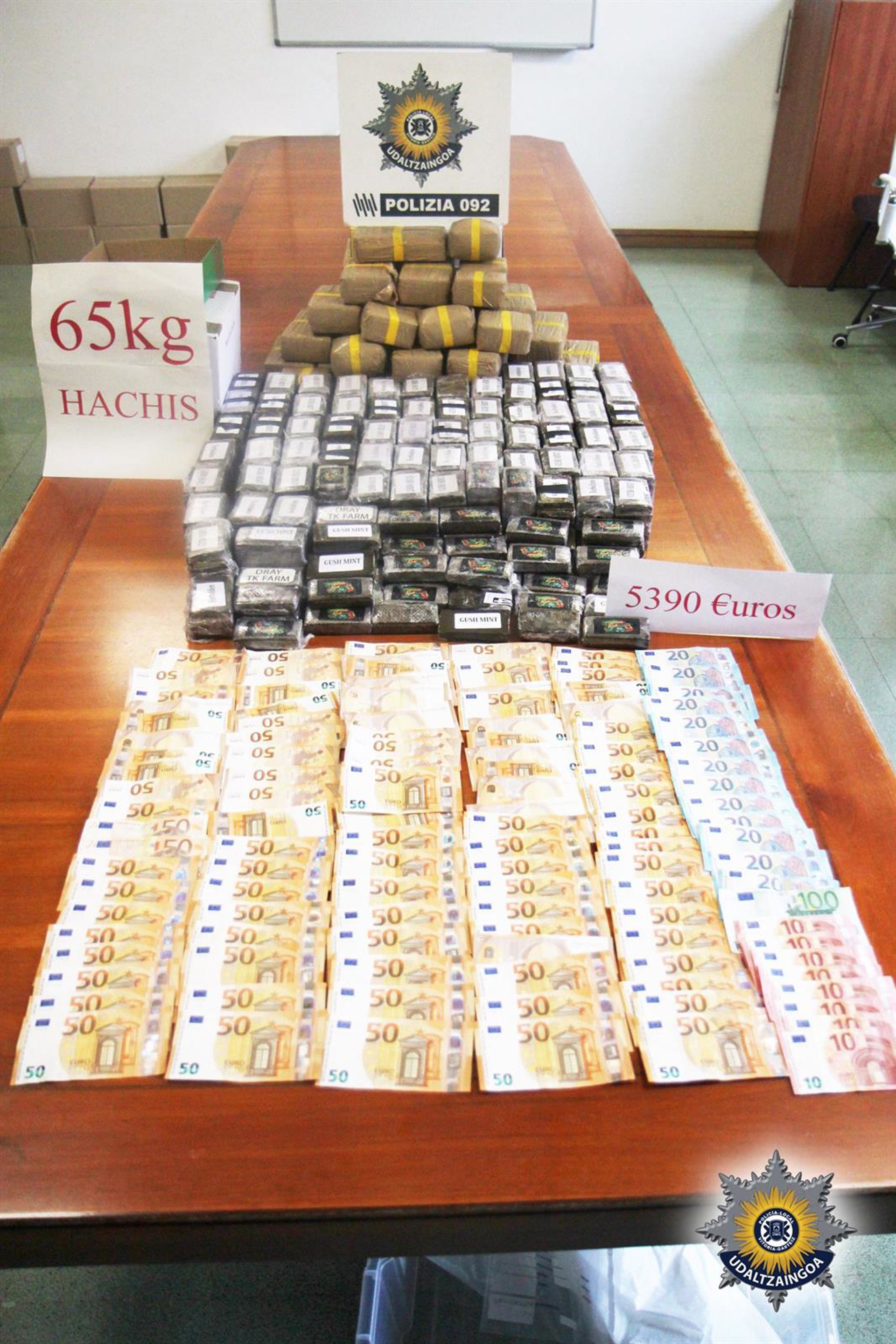 A partir del arresto se pusieron en marcha una serie de registros en dos vehículos y otras tantas viviendas, en los que se localizaron cerca de 65 kilos de hachís y alrededor de 5500 euros. Para estas acciones se contó, además, con la colaboración de la Unidad Canina de la Ertzaintza.