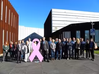 La presidenta de las Juntas Generales de Gipuzkoa, la jeltzale Eider Mendoza, y representantes de todos los grupos con representación en esta Cámara (PNV, PSE, EH Bildu, Podemos y PP) se han concentrado este miércoles en solidaridad con las personas afectadas por el cáncer de mama.