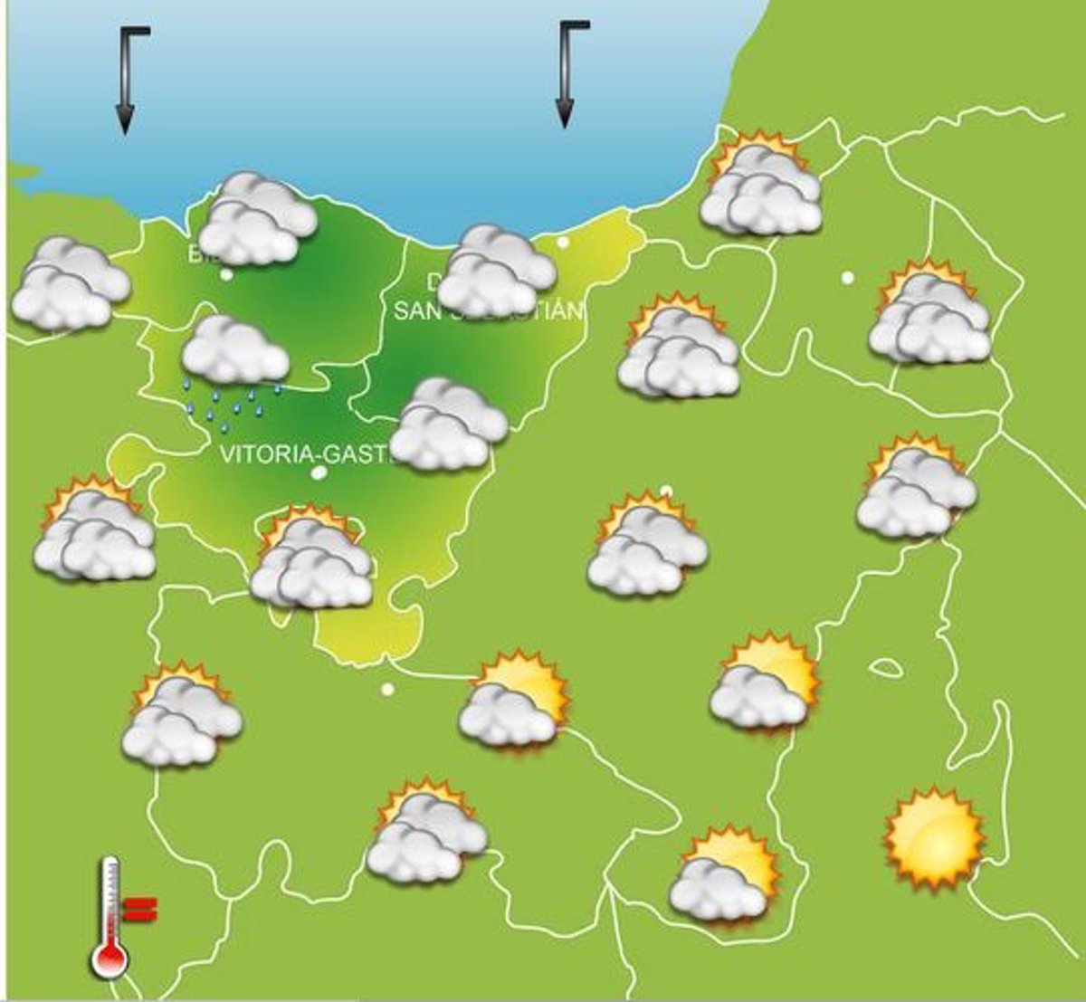 El mejor tiempo corresponderá a la mitad sur, donde se irán alternando las nubes y los claros. El viento seguirá soplando del norte y las temperaturas serán similares o ligeramente más altas, con máximas que llegarán a los 17 grados y mínimas que oscilarán entre los 7 y los 12 grados.