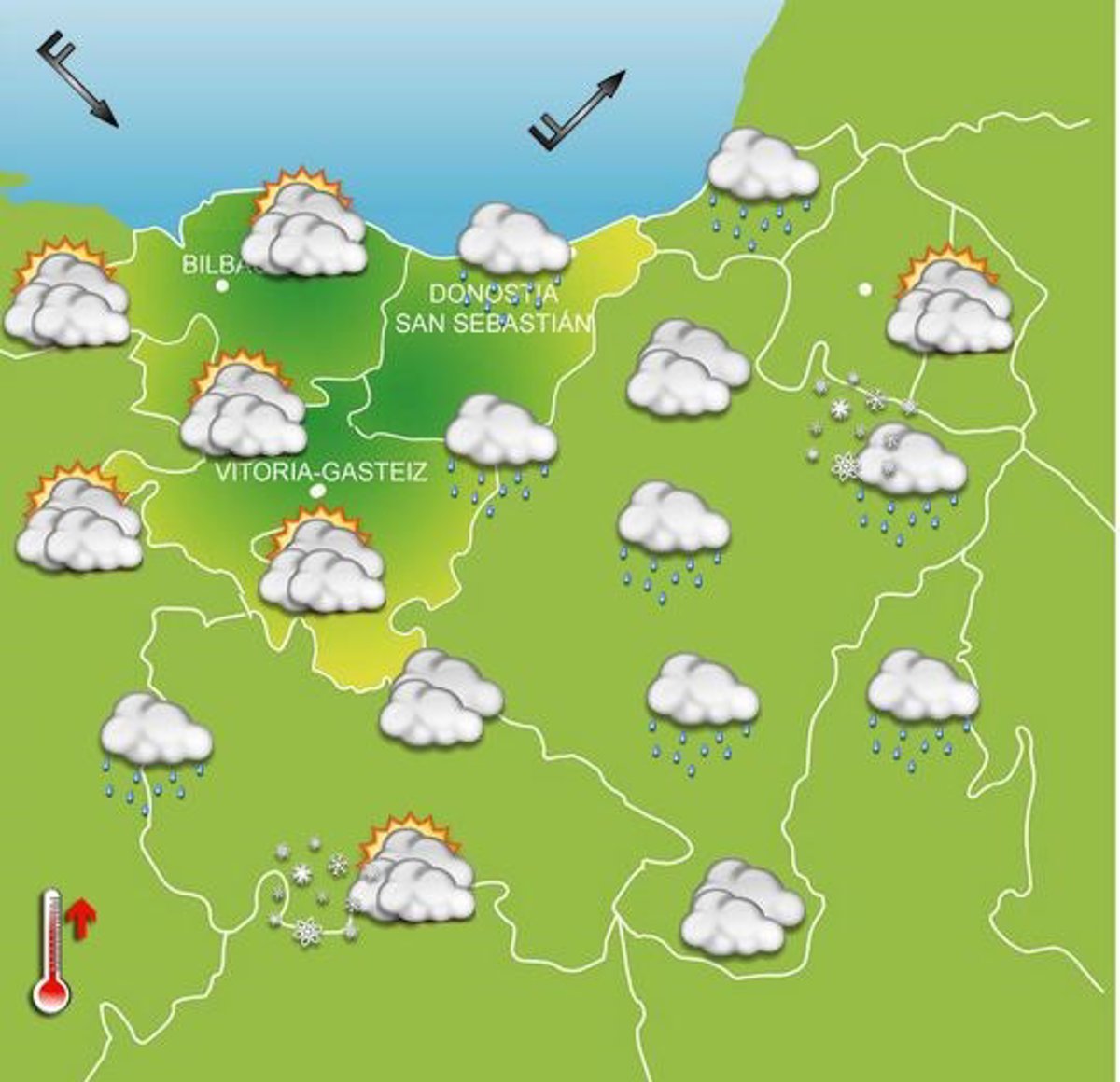 El viento soplará algo más intenso del suroeste, virando al noroeste durante la tarde. Las temperaturas diurnas subirán algo, sobre todo en la zona cantábrica, con máximas que llegarán a los 14 grados, mientras que la madrugada será algo más fría y podrá helar en puntos de Álava, con mínimas de entre 1 y 6 grados. La cota de nieve bajará al final del día hasta los 1.200 metros.