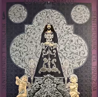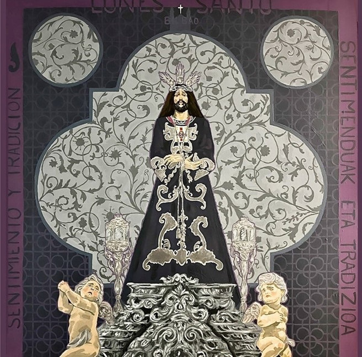 Este año el cartel de la procesión está firmado por el músico, pintor y escultor sevillano Ginés de Paula. Se trata de un óleo sobre tabla, con la figura de Jesús en el centro, con sus potencias --los tres rayos de luz que salen de su cabeza--, sobre una peana de plata con faroles en forma de carrete antequerano, todo ello envuelto sobre un bordado estilo rocalla rematado por la silueta de la Iglesia de San Francisco de Asís, con la leyenda 'sentimiento y tradición' y su traducción al euskera 'sentimenduak eta tradizioa'.